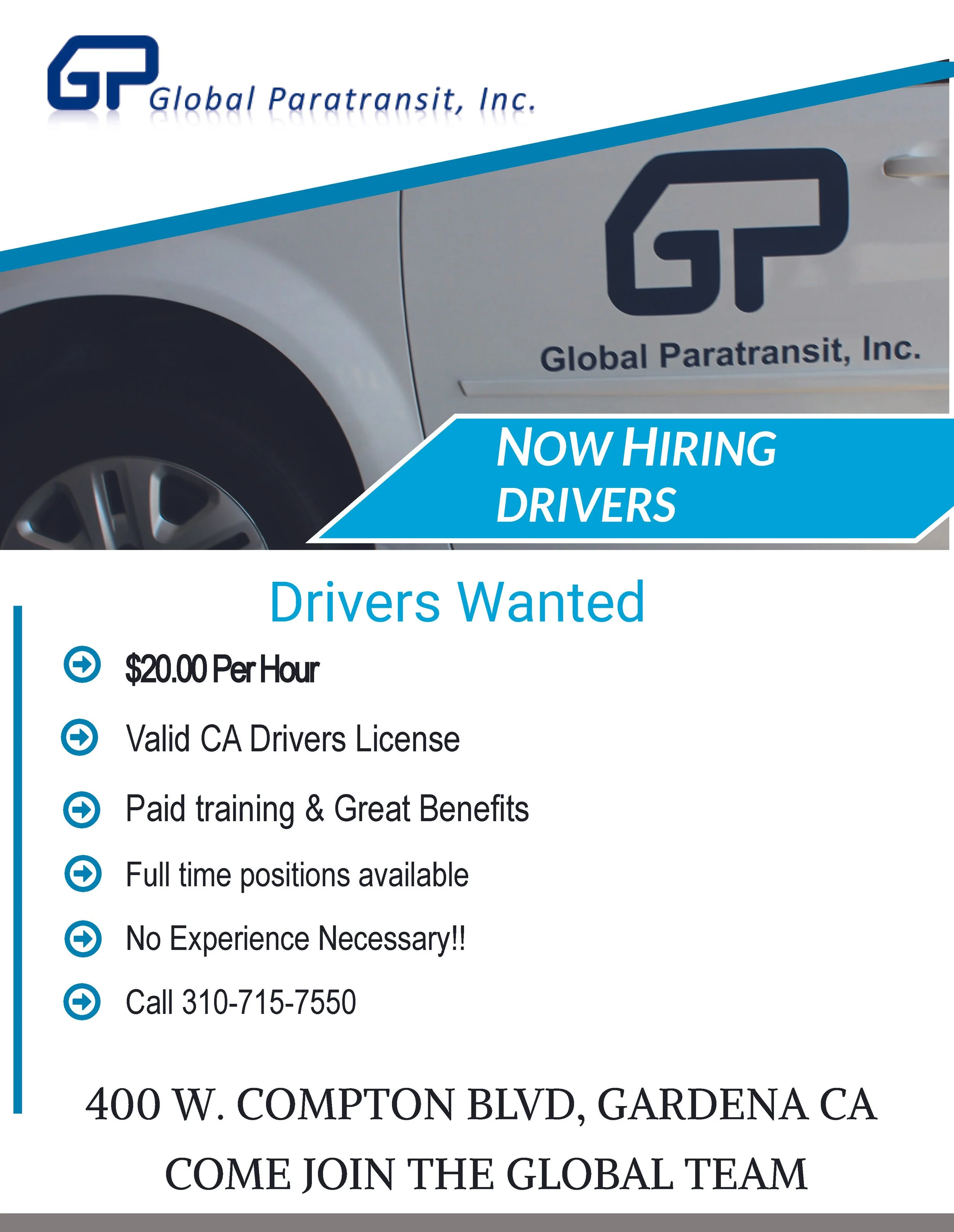 Driver’s Wanted (Job Opportunity) Jobs/Internships Mar 5 Written By West A EEP Call 310-715-7550 Global Paratransit provides transportation services for seniors and individuals with disabilities throughout Los Angeles County. They are currently hiring full-time drivers and would love for you to reach out. Job Board West A EEP